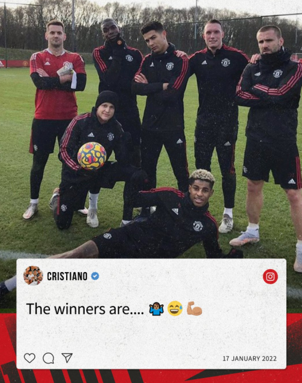 맨유는 18일(한국시각) 공식 트위터를 통해 캐링턴 훈련장 소식을 전했다. 공개된 사진에는 최근 부상에서 회복한 크리스티아누 호날두(맨유)와 포그바가 모습을 드러냈다. 두 선수는 루크 쇼·필 존스·마커스 래쉬포드와 함께 사진을 찍으며 “승자는…"(The winners are…) 이라는 글도 게재했다.